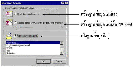 1. ที่ Startup Windows เลือก Access database wizard ในกรอบ Create a new database using