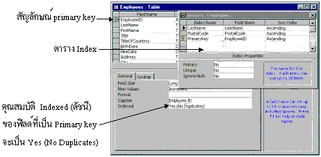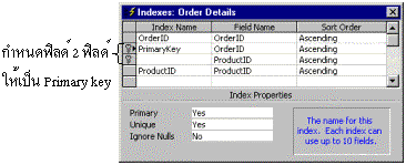 การสร้าง Primary key แบบ Multi - primary keyPrimary key แบบ Multi - primary key เป็น Primary key ที่ประกอบด้วยหลายฟิลด์ซึ่งมักจะใช้ในกรณีที่เป็น Table เก็บข้อมูลที่ประกอบด้วยหลายฟิลด์แล้วสามารถแสดงค่าไม่ซ้ำ โดยกำหนดฟิลด์ให้เป็น primary key ทุกตัวแต่ให้กำหนดชื่อ Index Name ที่ฟิลด์แรกเท่านั้น    |