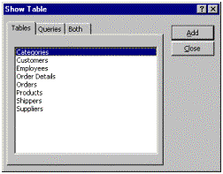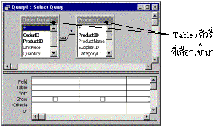New  ปกติถ้ามีการกำหนดความสัมพันธ์มาแล้ว Access จะเชื่อมฟิลด์ให้โดยอัตโนมัติ หรือฟิลด์ที่เชื่อมมีชื่อเดียวกันและประเภทข้อมูลเหมือนกัน แต่ถ้าไม่เกิดขึ้นก็ให้สร้างขึ้นมาเอง ซึ่งในการแสดงผลแบบหลาย Table การเชื่อมฟิลด์มีความจำเป็นเพื่อทำให้คิวรี่ที่สร้างขึ้น สามารถแสดงสารสนเทศของข้อมูลที่สัมพันธ์กัน ลักษณะของเส้นเชื่อม (Join) จะคล้ายกับเส้นเชื่อมของ Relationships โดยฟิลด์ที่เป็นเลข 1 จะเป็นด้าน "One" และฟิลด์ที่เป็นสัญลักษณ์อนันต์ (Infinity) หรือ จะเป็นด้าน many ส่วนการเชื่อมสร้างด้วยใช้การ drag ฟิลด์ระหว่างฟิลด์ที่ต้องการเชื่อม ที่ตาราง QBE ด้านล่างของคิวรี่มีแถวต่างๆในการใช้งาน คือ