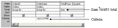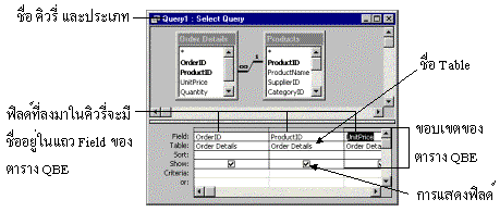 CriteriaCriteria พื้นที่ด้านล่างต่อจากตาราง QBE ใช้สำหรับการกำหนด Expression ในการคัดเลือกข้อมูลที่ต้องการ รวมถึงการคัดเลือกข้อมูลด้วย Parameter Query