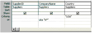 การประยุกต์ Criteriaการประยุกต์เป็นกำหนดเงื่อนไขเพื่อแสดงค่าที่ต้องการ การกำหนดช่วงของข้อมูลใช้ Operators ในการกำหนดขอบเขตหรือเงื่อนไขด้วย Between...And หรือ Comparison Operators ได้แก่ <, >, < >, < =, > = เป็นต้นไปจนสิ้นสุดตัวอักษร ในการอ้างถึงวันที่ปัจจุบันให้ใช้ Date() เช่น <=Date()-15 การใช้ตัวสัญลักษณ์ wildcard เพื่อค้นหาแบบเจาะจงบางส่วนเครื่องหมายดอกจัน (*) เช่น DA* หมายถึงค่าทั้งหมดที่ขึ้นต้น DA เครื่องหมายคำถาม (?) เช่น S?N หมายถึงค่าตัวที่สองเป็นค่าใดๆ อักษรตัวแรก คือ S และตัวที่สาม คือ N (SUN, SIN)