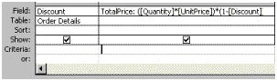 การสร้างฟิลด์คำนวณให้กำหนด Expression ลงในช่องฟิลด์ เช่น [Qty]*[UnitPrice] ซึ่งฟิลด์ที่อ้างถึงต้องอยู่ในวงเล็บสี่เหลี่ยม [ ]