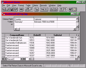 2. การสร้าง Criteria ใน MS Query2.5 การสร้าง Criteria แบบเป็นช่วงของค่าการสร้าง Criteria สำหรับการคัดเลือกข้อมูลเป็นช่วงของค่าสามารถใช้ Between … And ตามตัวอย่างใช้คอลัมน์ country และ subtotal โดยมีความต้องการทราบข้อมูลของลูกค้าที่อยู่ในประเทศ Germany และ มียอดใบสั่งซื้อตั้งแต่ 1500 ถึง 5000 1.